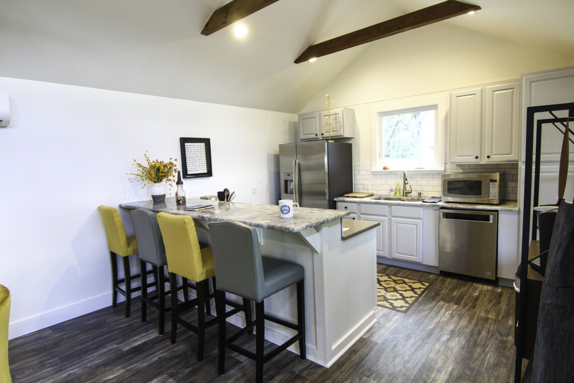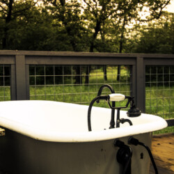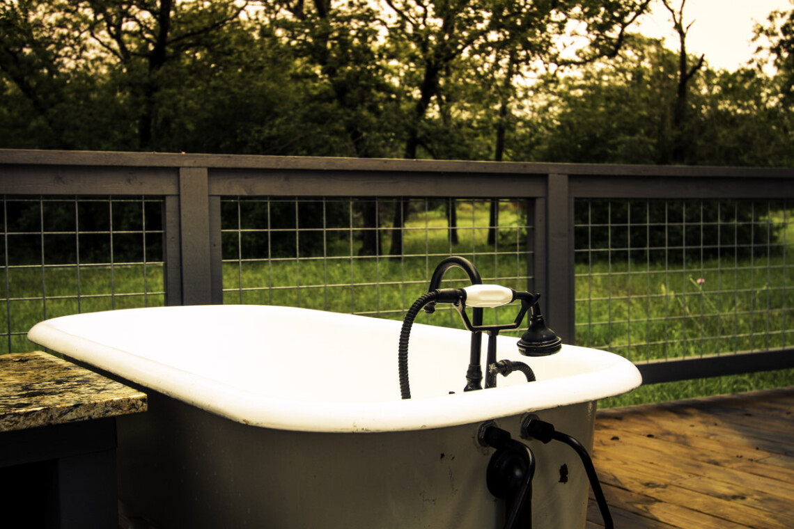 The layout is cute yet classy and is comprised of two adjacent buildings (one bedroom and bathroom, the other kitchen and family room area) joined by a wrap-around porch and divided by a private outdoor clawfoot tub! <3
