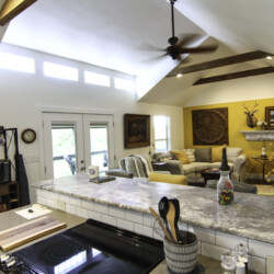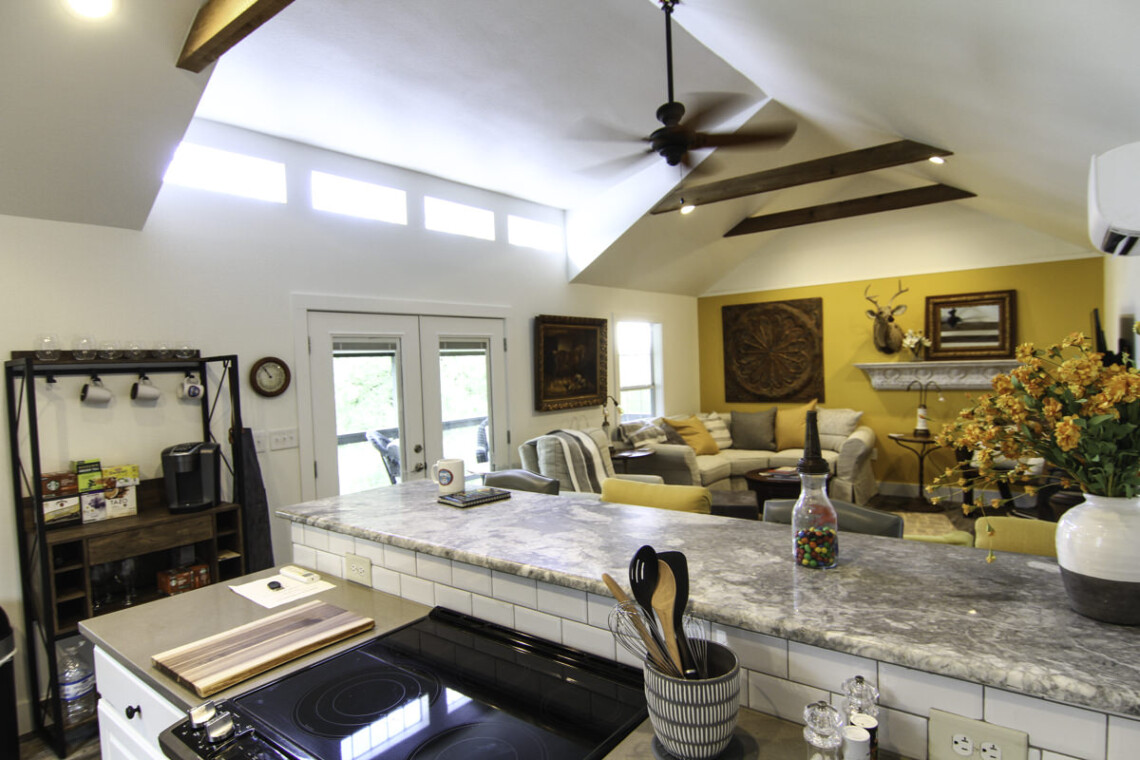 The Living Suite features a full kitchen with bar side seating, coffee nook, and a cozy living room with Television.